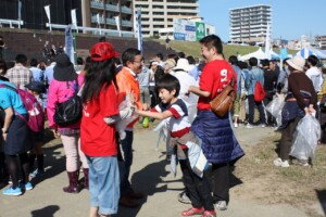 飯塚小学校・片島小学校の児童が、「自分たちの住んでいる地域が綺麗なまちであってほしい」との願いからゴミ箱を作ってくれました。当日12箇所会場に設置しました。その結果、花火大会が終了したばかりの河川敷の道路にもゴミがほとんど散らかっていません。地域のごみ問題について地域で考え、実践しています。