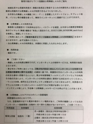平成29年、災害時における通信疎通の確保のため、音声通話以外の通信手段の充実・改善を図る観点と、地域住民や交流センター利用者が情報の取得及び発信するための利便性の向上を図る為に、災害時の緊急避難場所である地域コミュニティの機能を備えた飯塚交流センターに公衆無線LAN(Wi-Fi)を地域独自で整備しました。